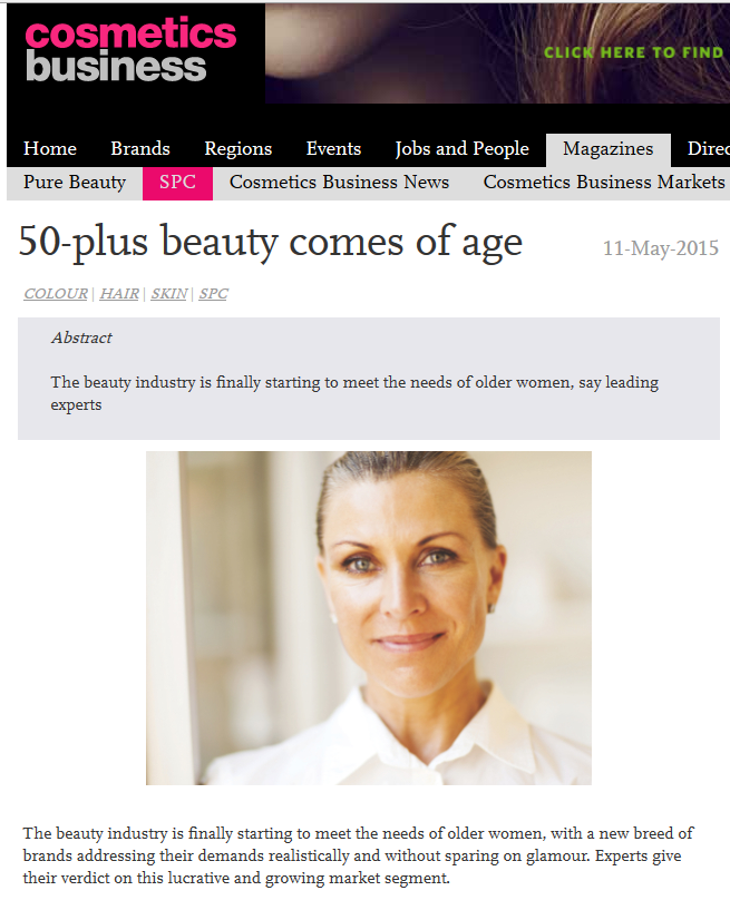 I was invited by beauty trade magazine SPC to give my expert opinion on older women and the beauty market. The full article is at http://www.cosmeticsbusiness.com/technical/article_page/50plus_beauty_comes_of_age/108210