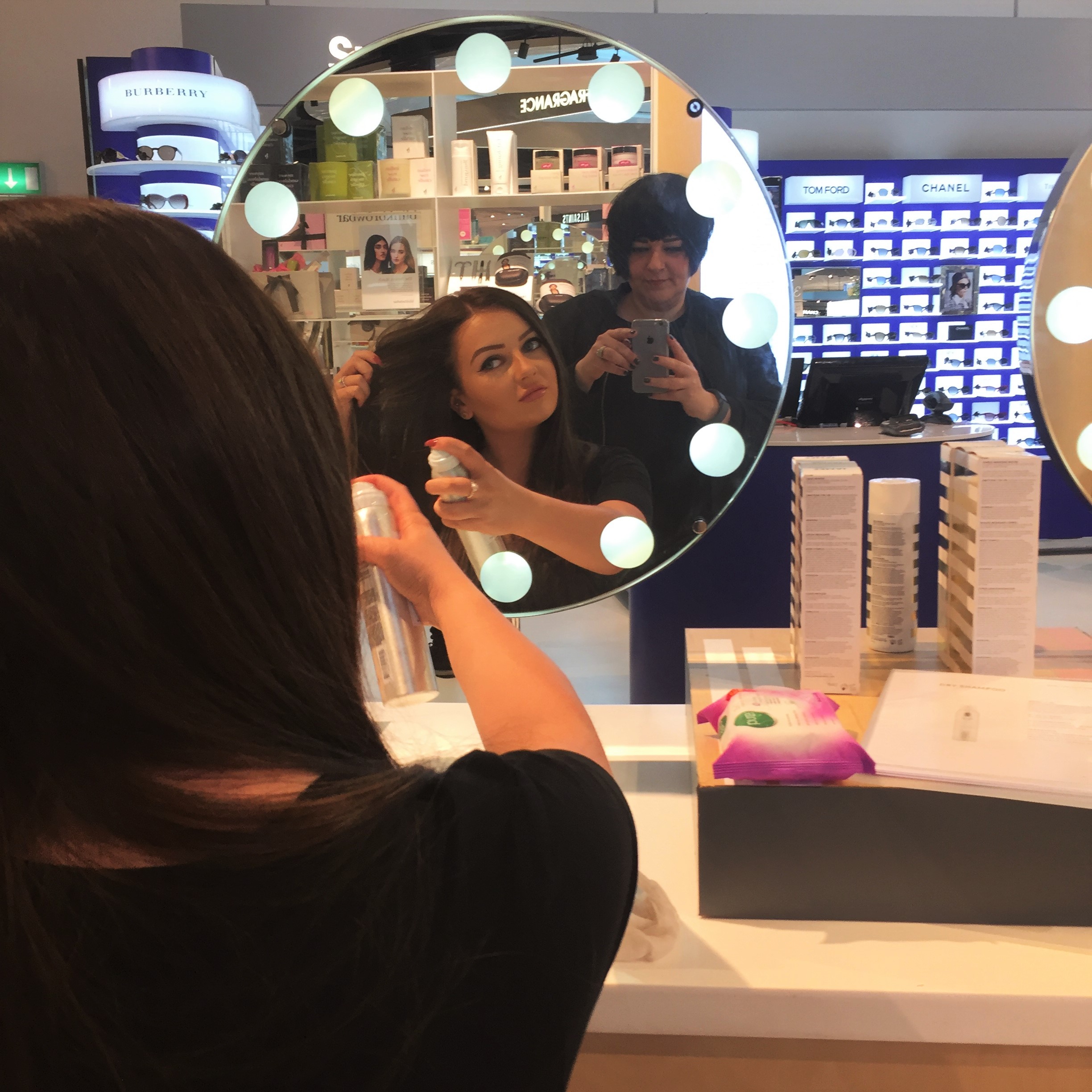 Nikki Taylor with a Selfridges Birmingham team member using OUAI Haircare
